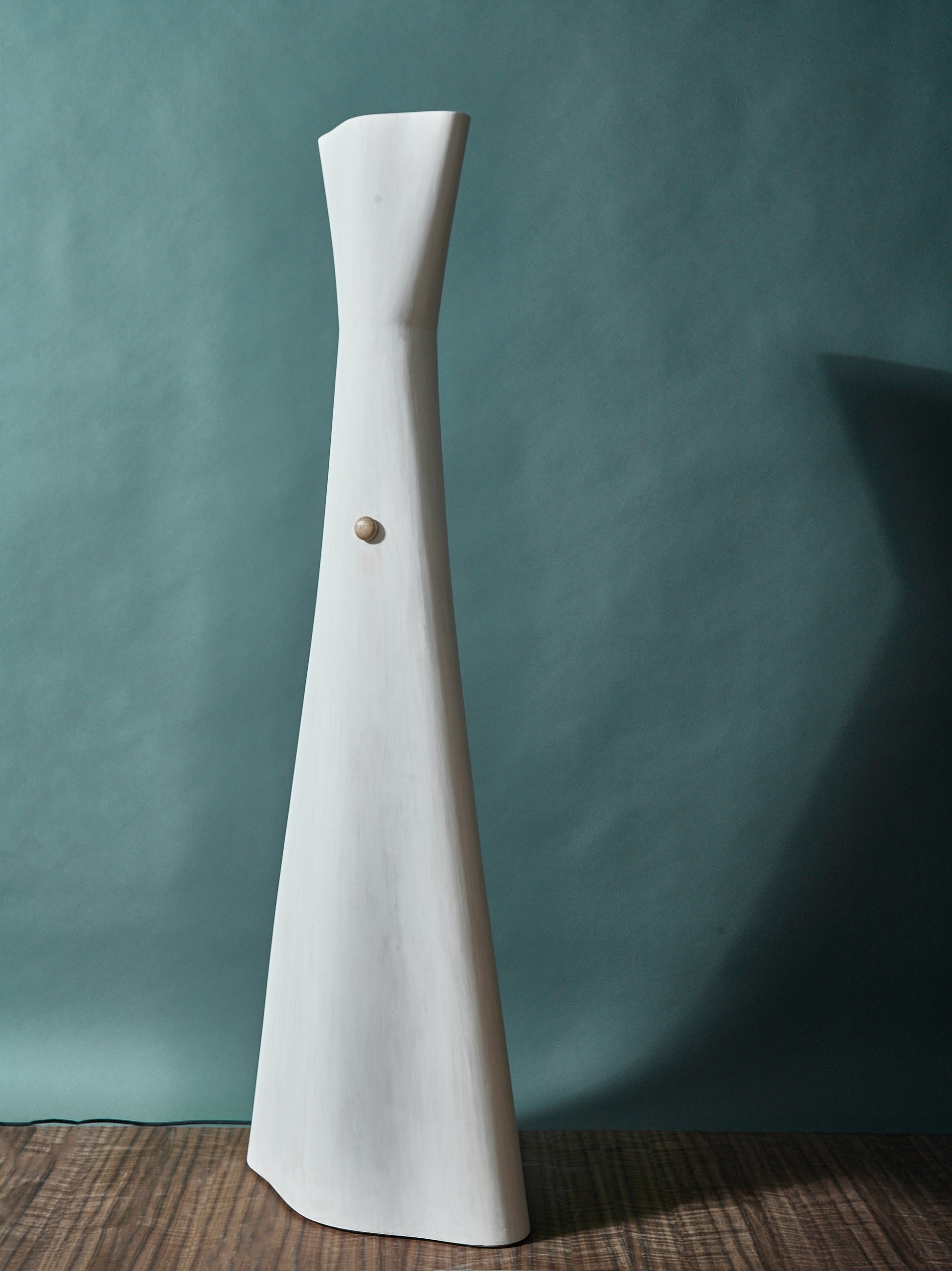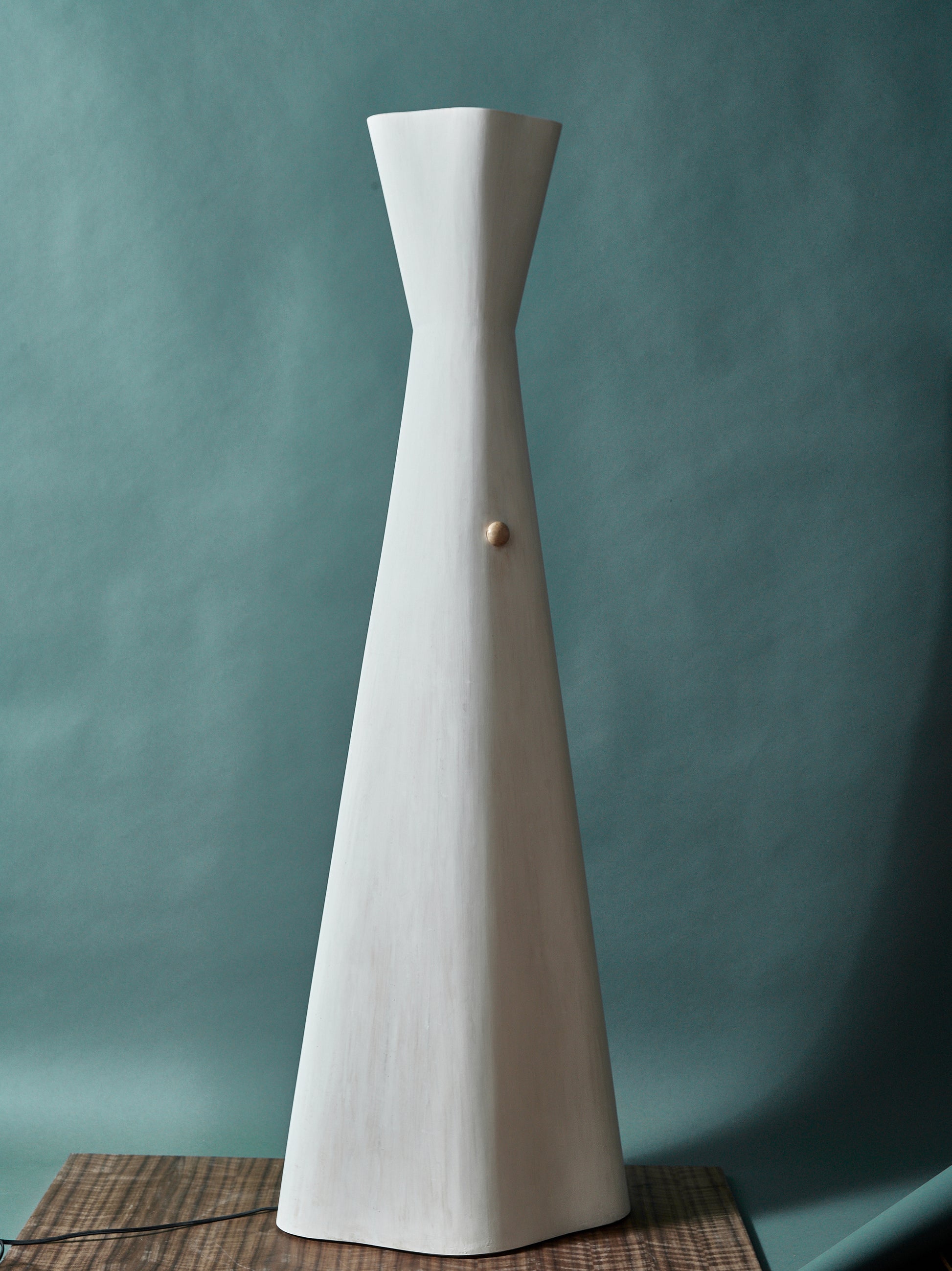The formerly monk lamp, now AGP02. Making this piece allowed me to play with a simple shape, distorting it into a tall, slender structure that appears to be one continuous piece of wood from base to shade. The making was relatively simple but time consuming as it required three layers of thin strips, steam bending, and thousands of staples and glue to give it rigidity. Despite being taller than me, the piece weighs less than 15 pounds when the interior formwork is removed.